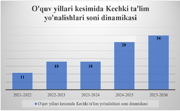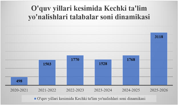 В Ташкентском международном химическом университете, с учетом реальной потребности рынка труда в кадрах, предложений работодателей, а также пожеланий абитуриентов, начиная с 2020–2021 учебного года, учебный процесс в форме вечернего обучения был организован по 11 направлениям подготовки: