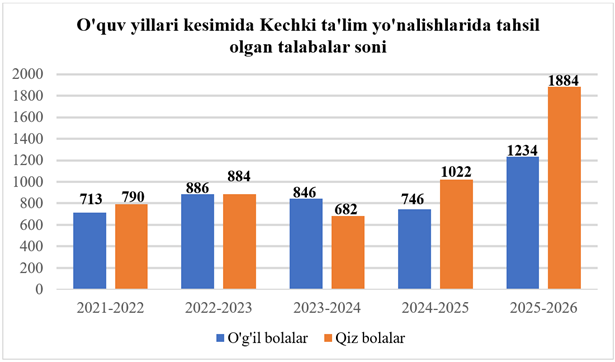 Направления вечернего обучения Ташкентского международного химического университета были организованы в 2020–2021 учебном году. Интерес студентов к обучению по вечерней форме, а также удобное время занятий для сотрудников работодателей наглядно отражаются в ежегодном увеличении количества направлений и числа обучающихся. Регулярно проводятся мероприятия, направленные на стимулирование студентов вечернего обучения к работе над собой и проведению научно-исследовательской деятельности. В университете созданы все необходимые условия для успешного обучения студентов и их формирования как высококвалифицированных специалистов.